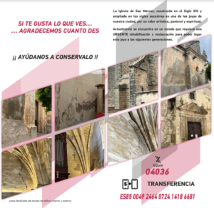 Motivada por las últimas lluvias caídas, tras el desprendimiento de mortero de cemento de una de las bóvedas, la Iglesia de San Marcos se mantendrá cerrada hasta la colocación de una malla de protección. Trasladándose las celebraciones litúrgicas de lunes a sábado a las 13hrs al Convento de la Orden…